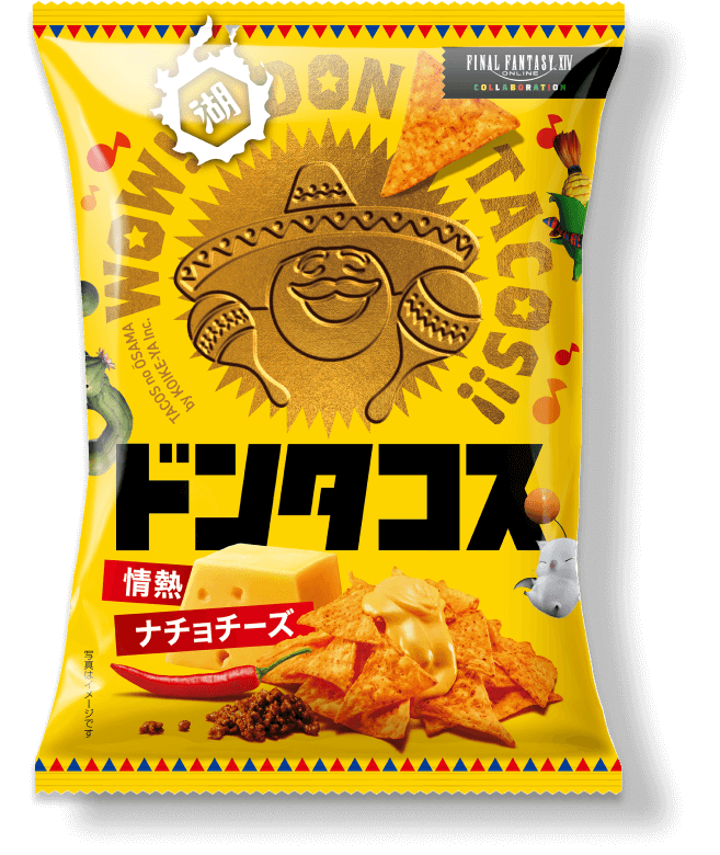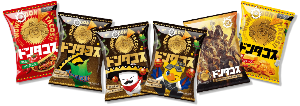 In 2025, Final Fantasy XIV collaborated with Koikeya Don Tacos to release a special “Rroneek Steak” flavored chip. Their Chili Taco and Nacho Cheese flavored chips also came in special packaging.